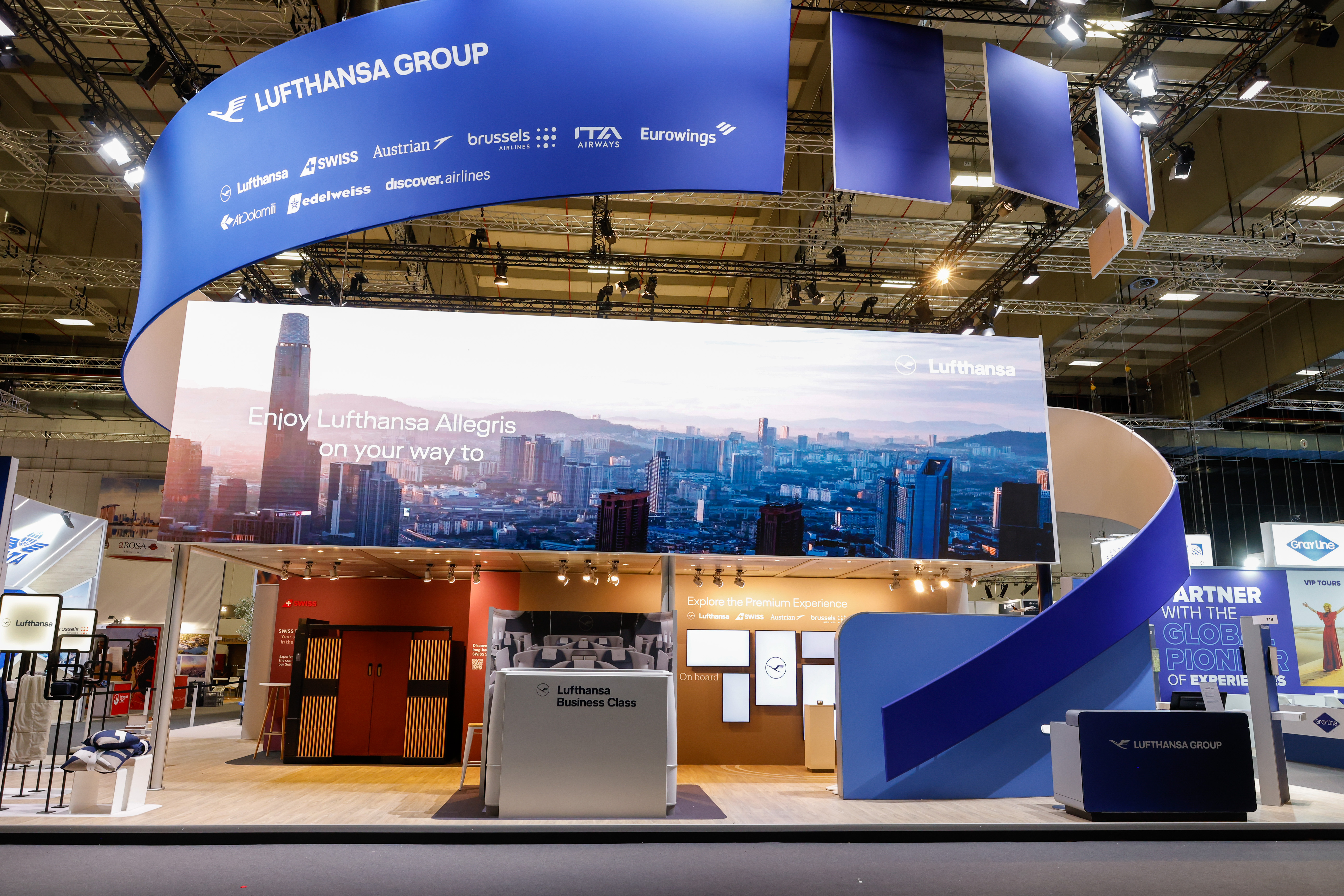 ET GLOBAL entwickelte dafür einen offenen, architektonisch klar strukturierten Messestand, der die verschiedenen Airlines der Lufthansa Group unter einer gemeinsamen Dachmarke zusammenführt und gleichzeitig Raum für Produktpräsentationen, Austausch und persönliche Begegnungen schafft.